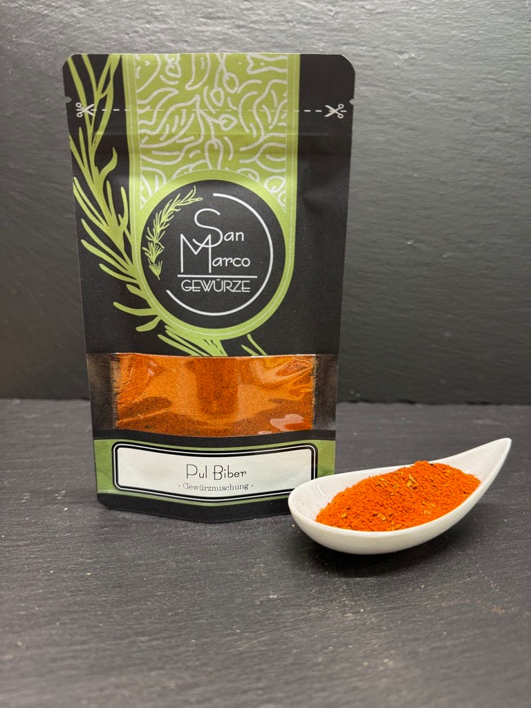 Hol dir den Geschmack der orientalischen Küche direkt nach Hause – mit unserem hochwertigen Pul Biber Gewürz von San Marco Gewürze. Diese klassische türkische Gewürzmischung vereint scharfen Chili, aromatische Paprika, fruchtigen Sumach, Oregano und feines Meersalz zu einer perfekt ausbalancierten Schärfe mit mediterranem Flair.